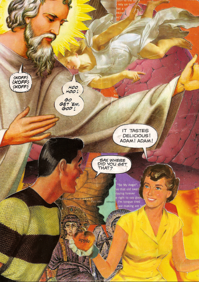And there was glue, applied to icons of the holy, the kitschy, the comic, and the kooky; surreal landscapes featuring damsels and dinosaurs, nudies and nerds, monkeys and moon rockets.