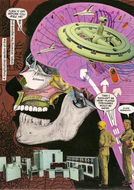 • One of my favorite themes in Marty’s work is his ability to locate technology and its effects both inside and outside the human. (Space Stations inside the brain of a man in distress, and two men observing that maybe video game playing is about as serious as they need to get.)