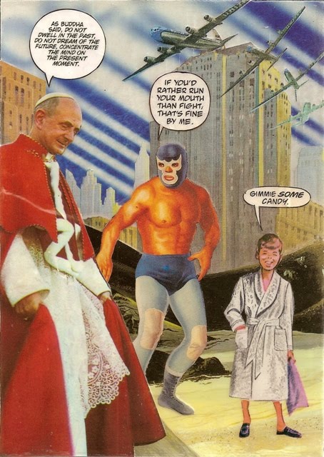 • He’s suggesting that we live in a time of confusion, where we have a hard time understanding what best serves and ennobles human culture and civilization. (The Pope wants the wisdom of the Bhudda, a professional wrestler wants to pretend-fight, and a child wants candy while planes head toward skyscrapers.)