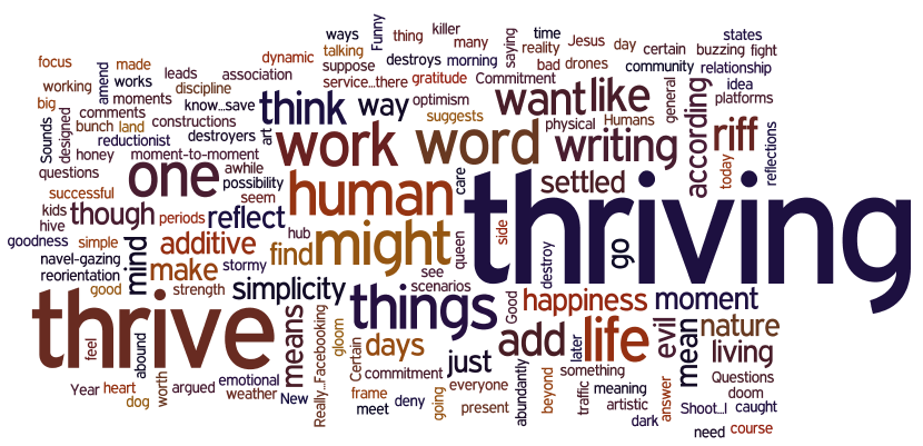 Before I riff on the meaning of the word, though, I think I’ll riff on why I’ve settled on “thrive.”  It’s simple: it has life embedded in it, it suggests both action and being, and it’s what I want for my wife, my kids, and everyone I care about.   Jesus said, “I came that they might have life, and have it more abundantly.”  Sounds like thriving to me.   And as I reflect, and reflect on my reflections (I know, I know…save the navel-gazing comments for later), it all seems to be trying to answer questions about what it means to be human, and what it means for human beings to thrive according to their nature.   Questions of being and doing, of art and mind, of beauty and goodness, of relationship and faith–all of these point toward something beyond happiness (which is not a bad thing, by the way.  Let’s not be reductionist on how highly we value happiness).   For me, “thriving” doesn’t deny the physical and emotional weather that can go dark and stormy for certain periods of time, but rather orients us to how to meet those days with energy, grit, optimism, and faith.